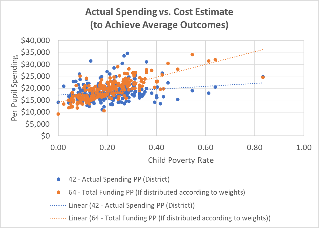 Our 2018 study generates empirical estimates of the per pupil costs to achieve statewide average outcomes, across every district in the state. We then convert those cost estimates into a weighted calculation formula. If that outcome is presumed sufficient, we can start there for setting the foundation level of funding needed in each district to achieve that goal, which is exactly what we did. Presently, some districts spend enough to achieve that goal and their students exceed that goal, while others do not. Actual spending compared to our cost targets, generated by applying our weights, looks like this (in 2018):