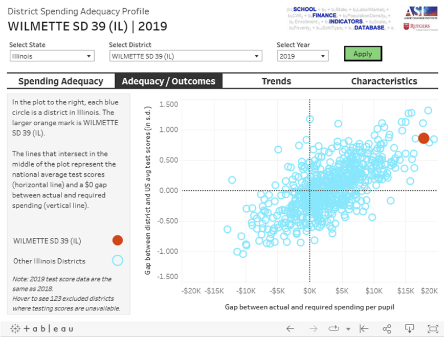 Let’s take a look at where Chicago and Wilmette fall in our data visualizations of existing spending – compared to costs of national average outcomes – and actual outcomes. In short, just as the quintile average spending gaps above align with the outcome gaps (for our models, but not for the EB models), the City of Chicago is shown to fall in the lower left quadrant – spending less than needed to achieve national average outcomes (by several thousand per pupil) and fall below national average outcomes. By contrast, Wilmette spends well above what would be needed to achieve only national average outcomes, and far exceeds national average outcomes.