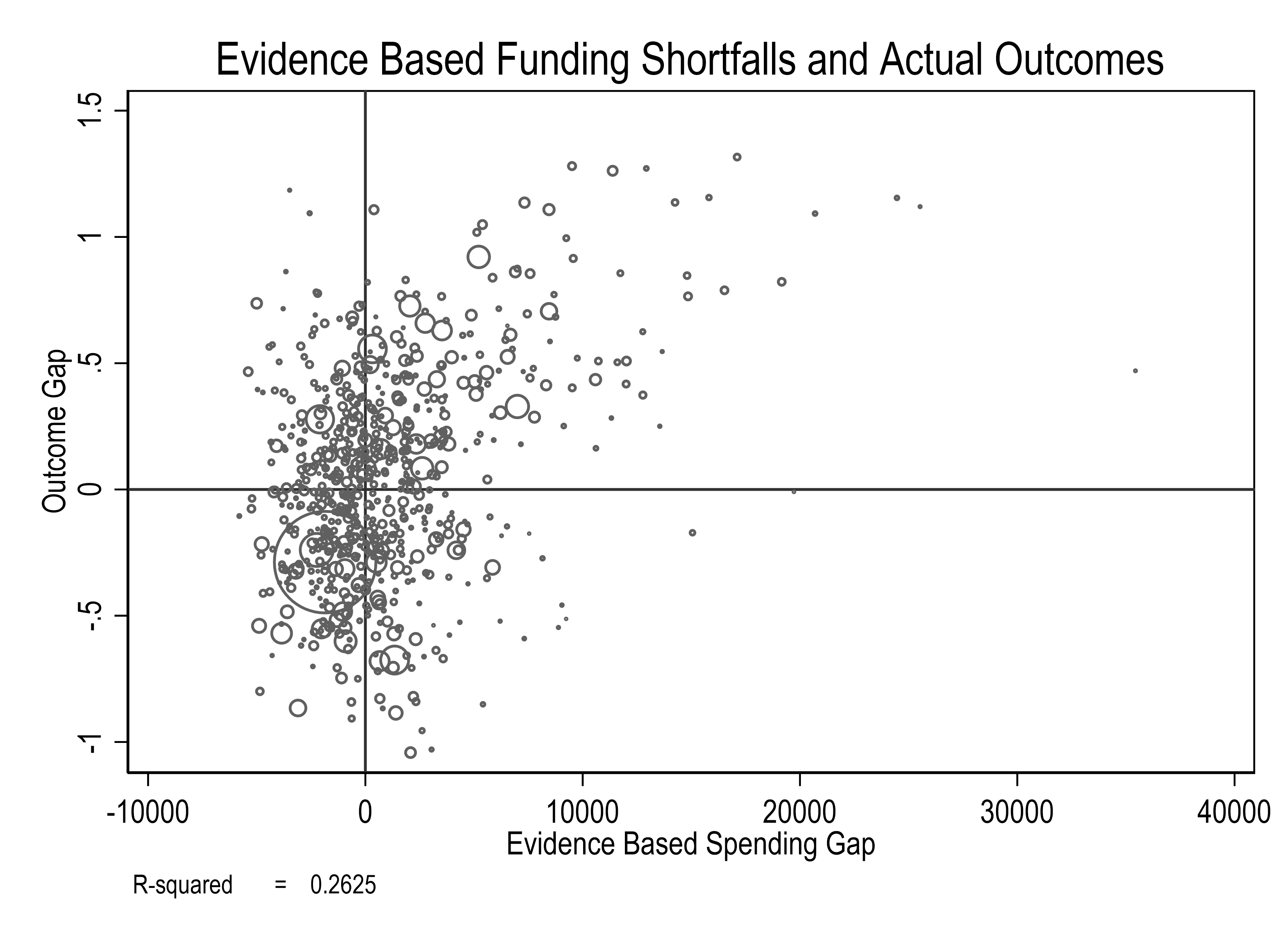 Here’s where it gets particularly fun. Here, I apply a validity check – a basic smell test – on the evidence based model compared to our national cost model. It would stand to reason that districts estimated to need more to achieve any specific outcome target likely currently fall below that target. Further, that districts with larger funding gaps would have larger outcome gaps – though an imperfect scatter.