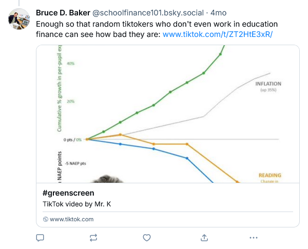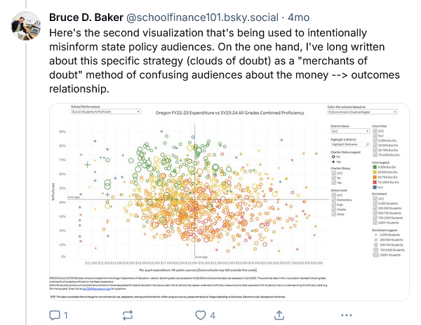 I’ve also explained that the two most disingenuous junk analyses oft used to “display” that money doesn’t matter are various forms of the “long term trend” graph (money went up, outcomes were stagnant or went down, so money can’t matter) and the “clouds of doubt” graphs (with money on the X and outcomes on the Y, there’s no apparent relationship). These bogus assertions and deceitful illustrations should have died a long time ago. Why? because they are bogus and deceitful and because those who now insist on continuing to use them have been informed, over and over again. So they are bogus and INTENTIONALLY deceitful. Period. Full Stop. (and not this author’s first offense by any means)